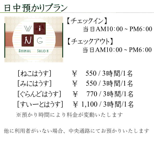 法的表記 動物愛護法に基づく表記 登録名称:あにまるサロンWiNG 登録番号:第183102055号(保管) 登録年H30年08月02日 期限:令和5年08月02日-令和10年8月1日 動物取扱責任者名:林 美咲